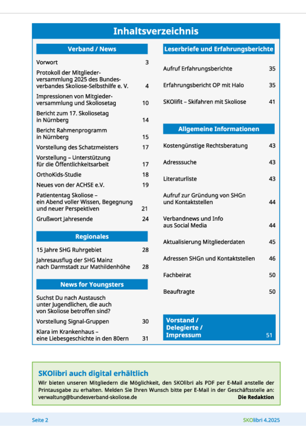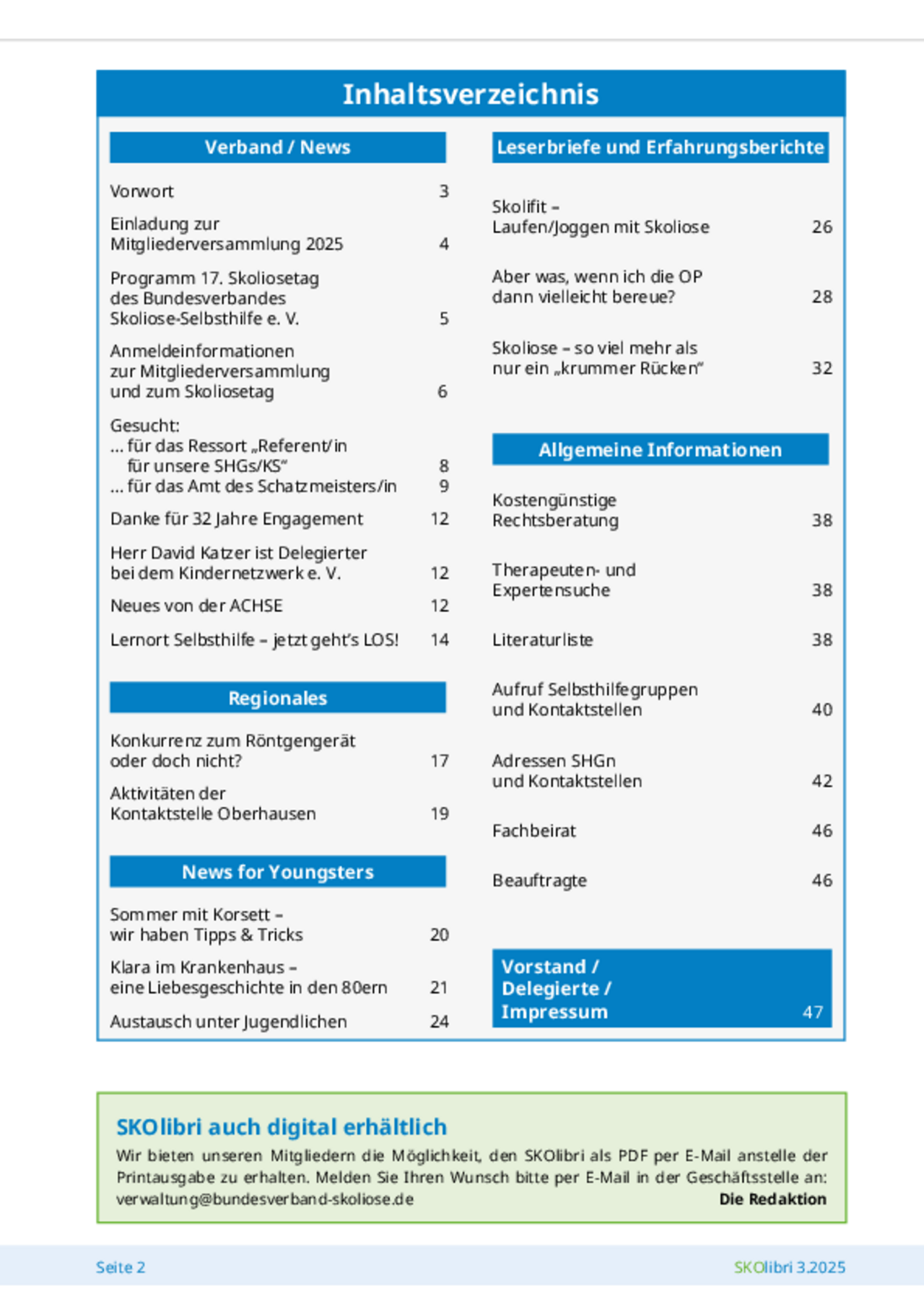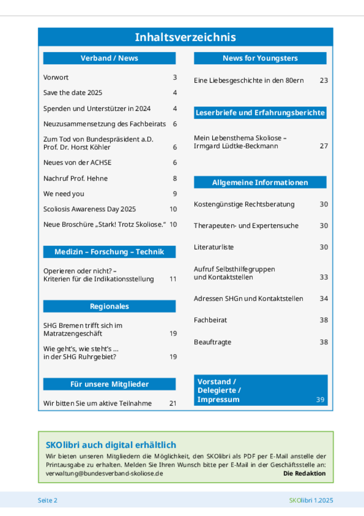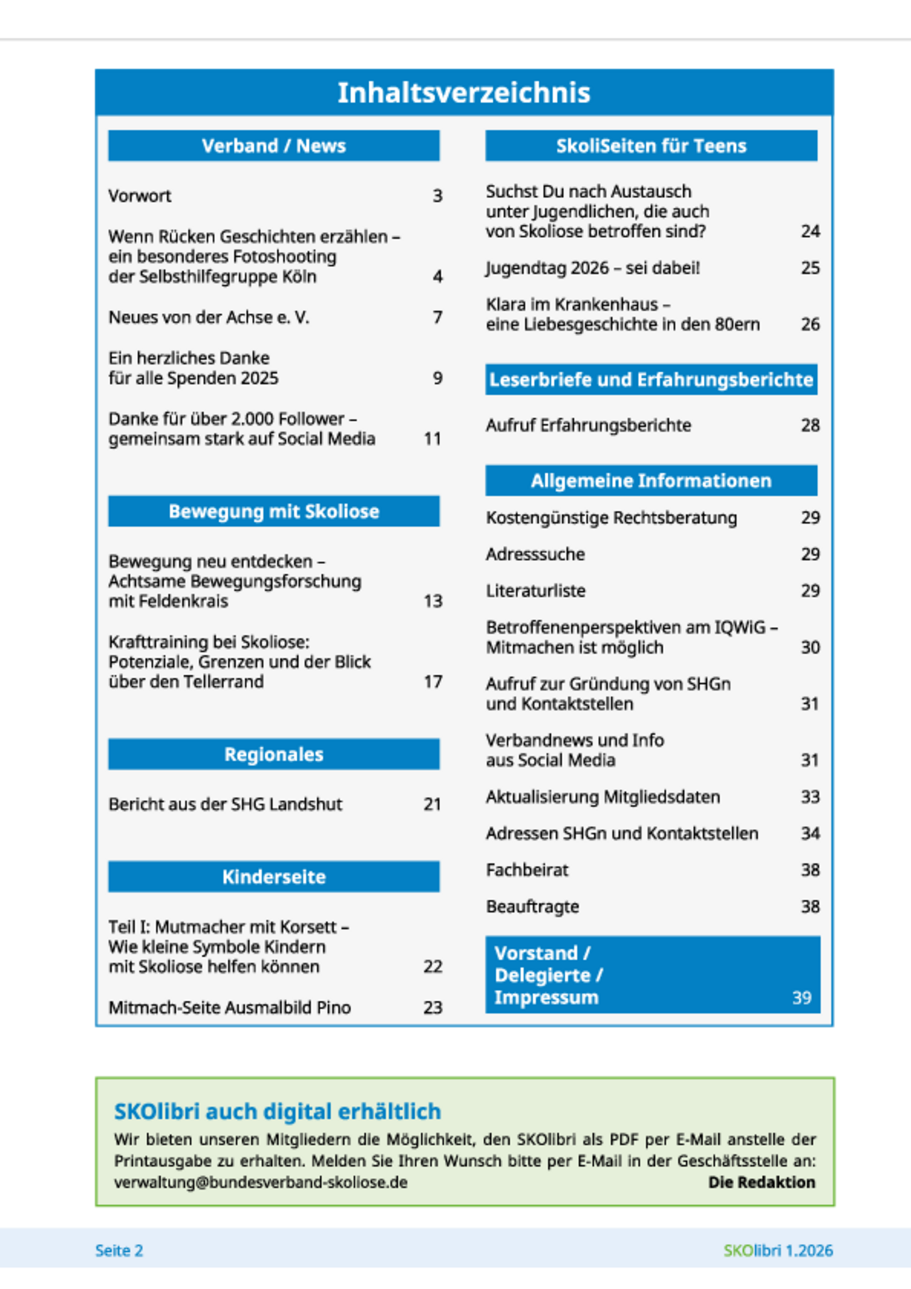 Die Verbandszeitung erscheint viermal im Jahr (Februar, Mai, August, November) als Print- und Digital-Medium und beinhaltet aktuelle Informationen rund um die Skoliose, unter anderem Aktivitäten der Selbsthilfegruppen, medizinische Beiträge, Erfahrungsberichte oder Leserbriefe.