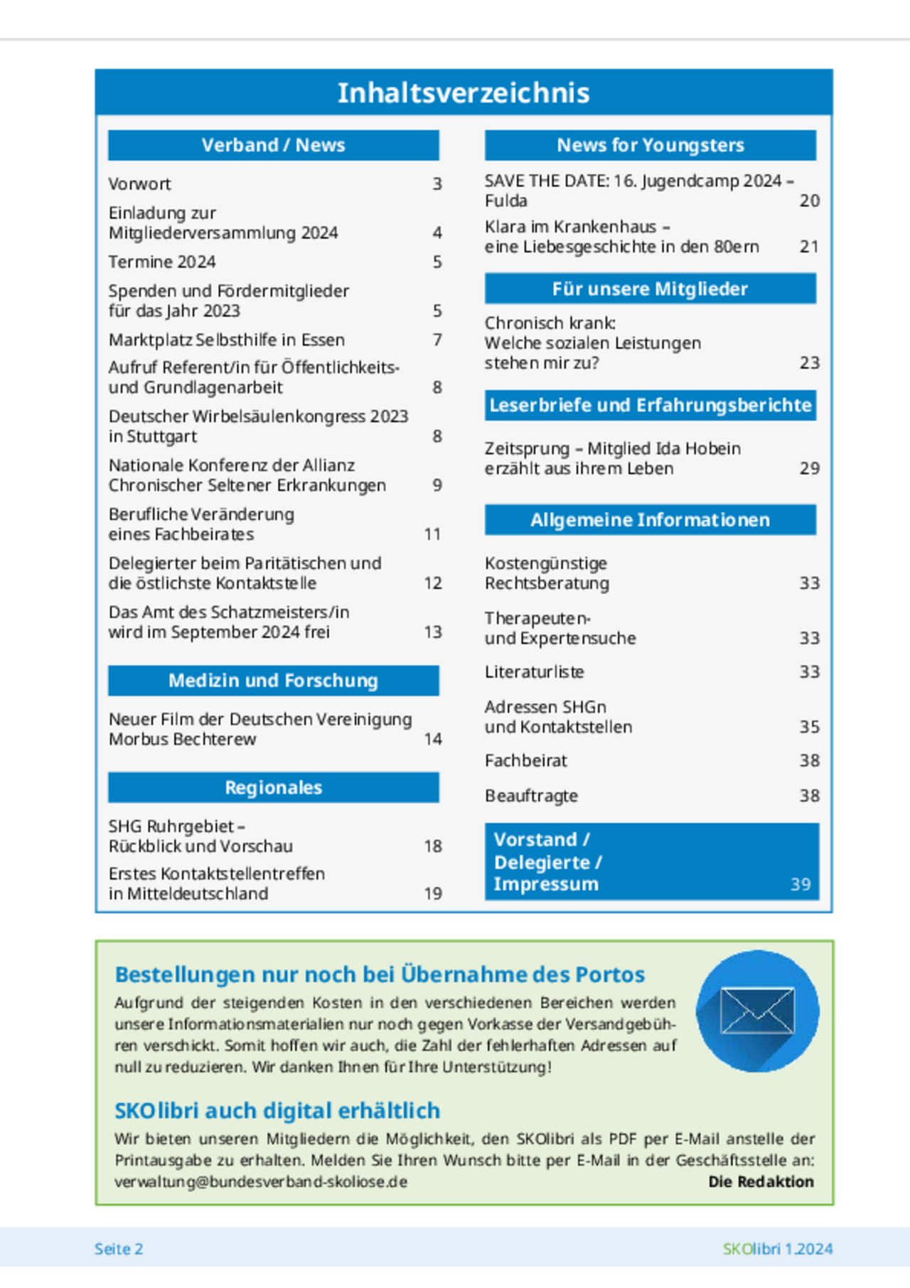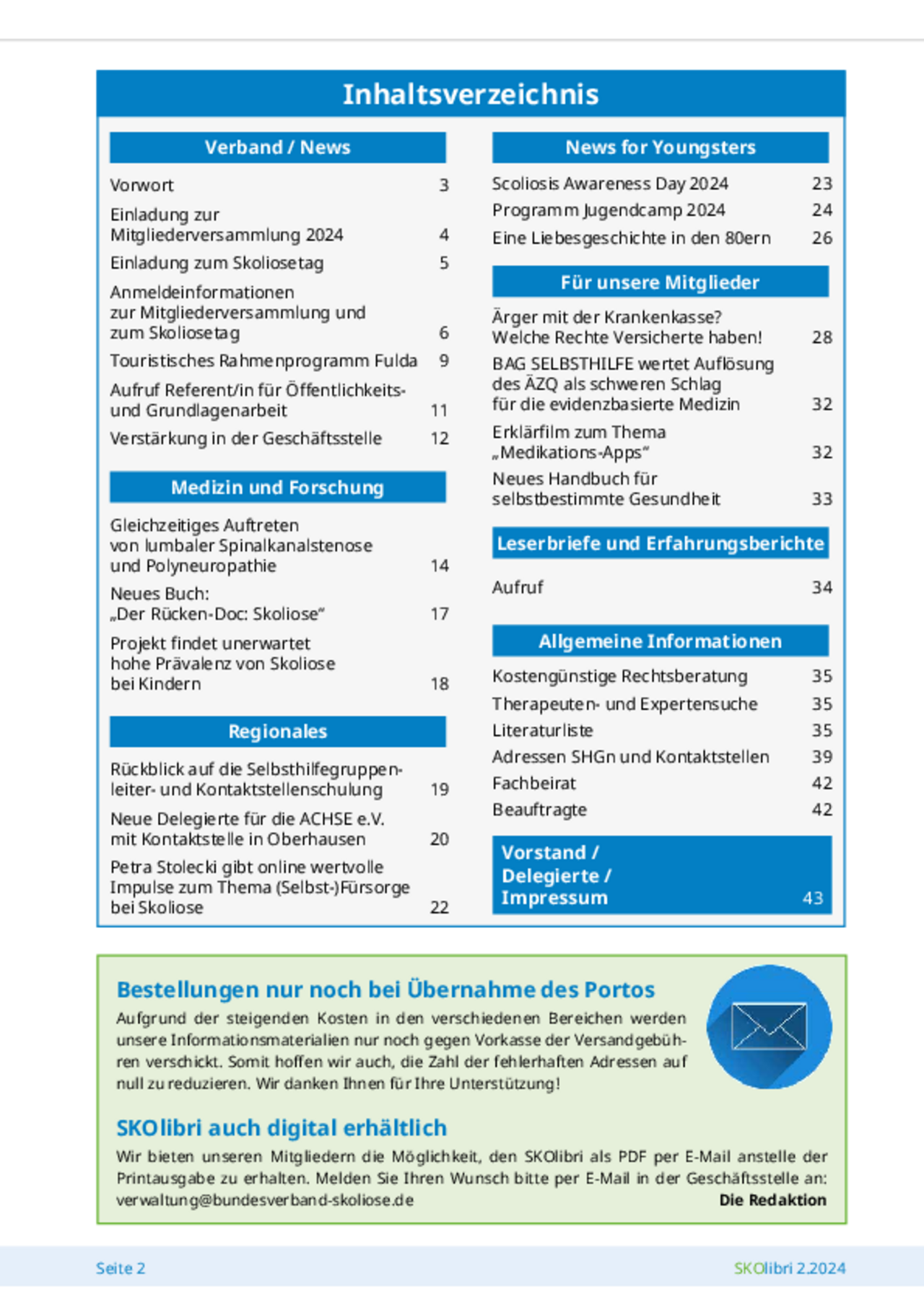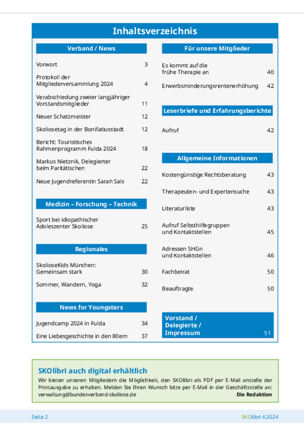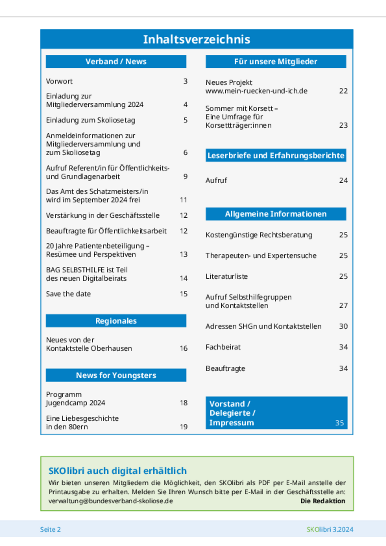Die Verbandszeitung erscheint viermal im Jahr (Februar, Mai, August, November) als Print- und Digital-Medium und beinhaltet aktuelle Informationen rund um die Skoliose, unter anderem Aktivitäten der Selbsthilfegruppen, medizinische Beiträge, Erfahrungsberichte oder Leserbriefe.
